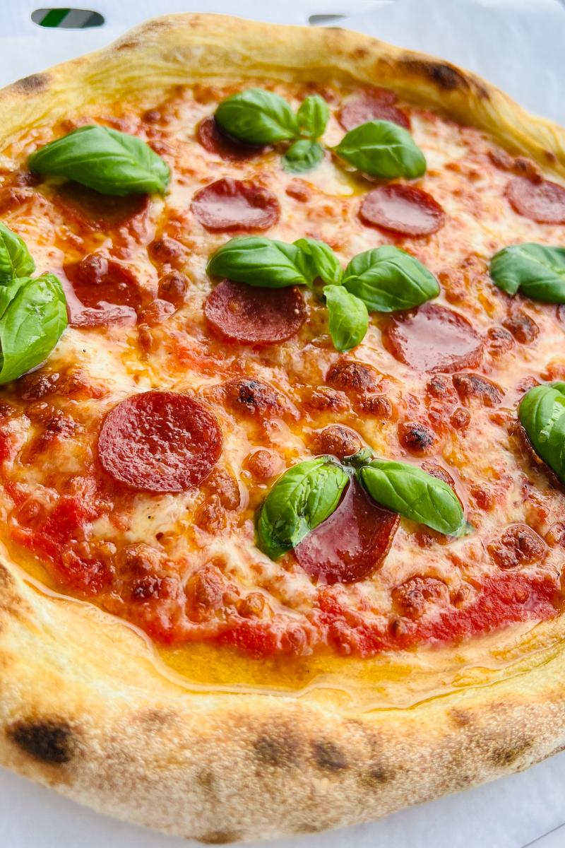 Surdeigspizza med tomatsaus, revet mozzarella, Pepperoni og basilikum.