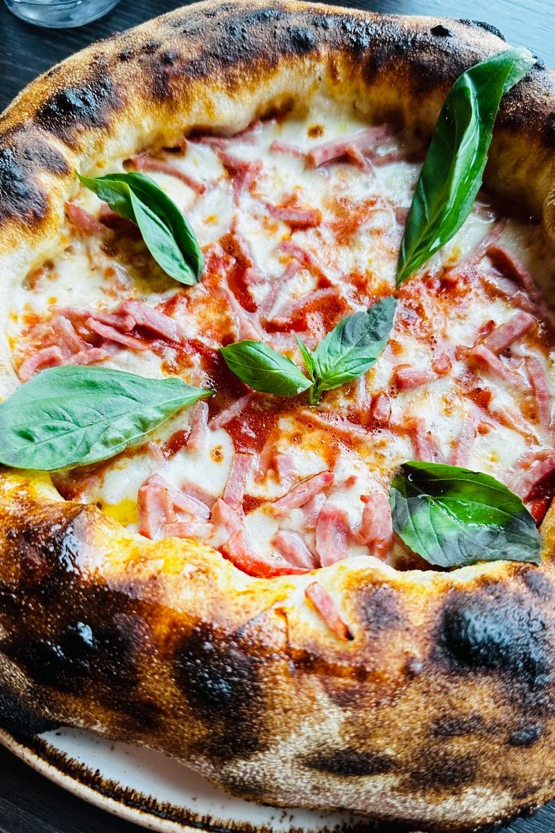 Surdeigspizza med tomatsaus, revet mozzarella, kokt skinke og basilikum.