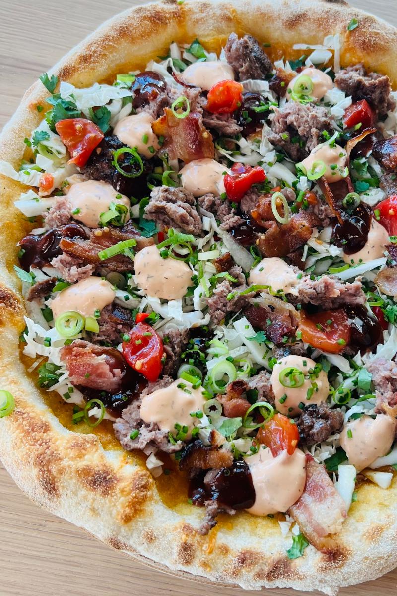 Surdeigsbunn stekes med tomatsaus og mozzarella. Vi griller burgerkkjøttet og legger dette på sammen med bacon, semitørket cherrytomater, hjertesalat, bbq saus, cheddarsaus og dressing. Helt magisk.