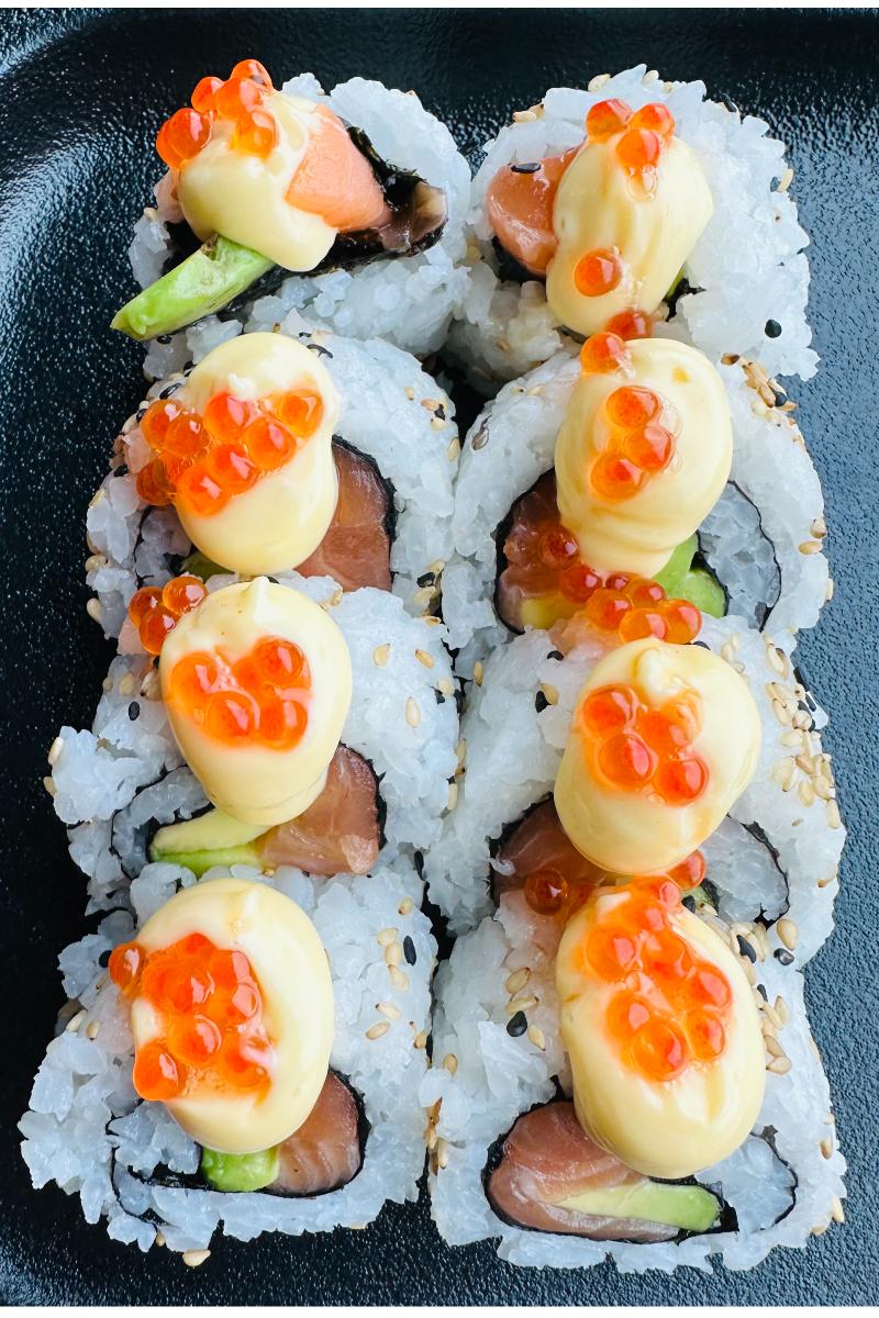 Salmon, avocado inside. Sprinkle sesame. Truffle mayo points, trout caviar