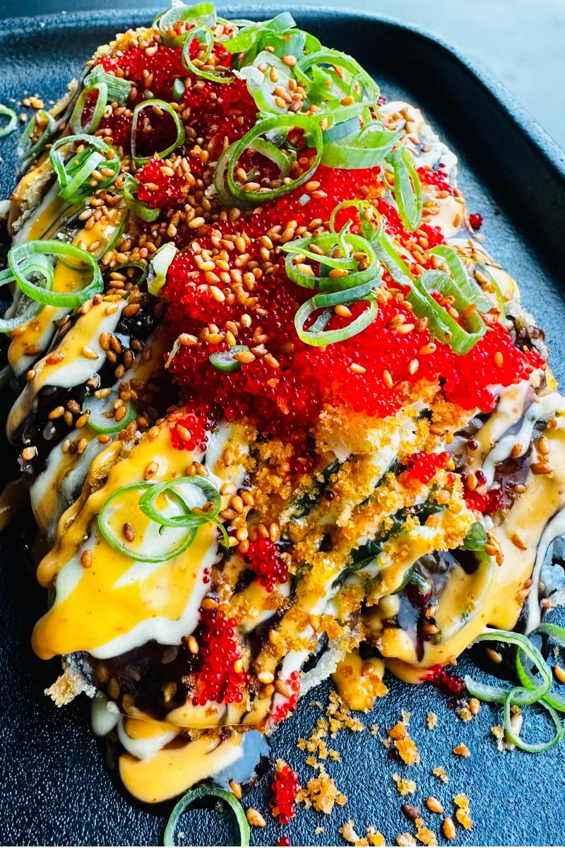 Hot & Dirty Chicken toppet med Teriyaki sauce, chili mayo, Wasabi mayo, pickled ginger, wakame, Spicy rice crisp, tobikko, chives & Kim chee sesame.