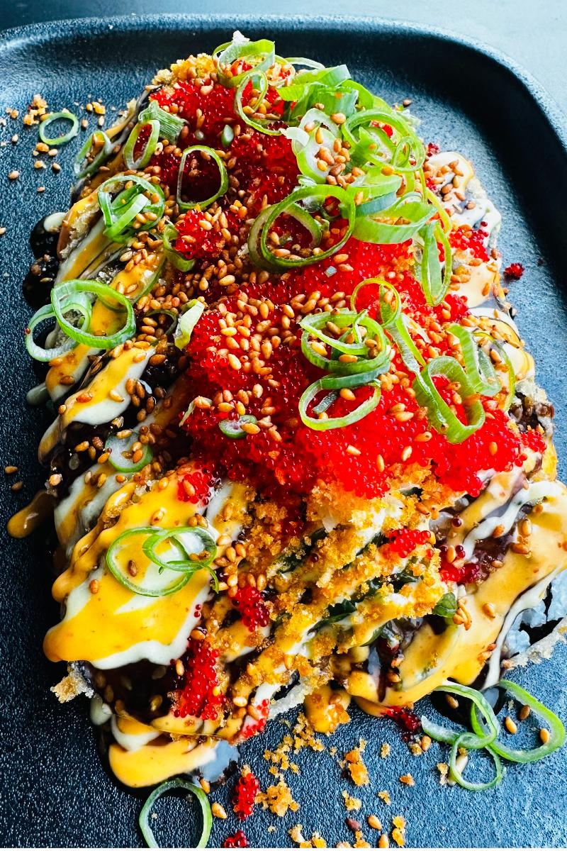 Hot & Dirty Salmon toppet med Teriyaki sauce, chili mayo, Wasabi mayo, pickled ginger, wakame, Spicy rice crisp, tobikko, chives & Kim chee sesame.