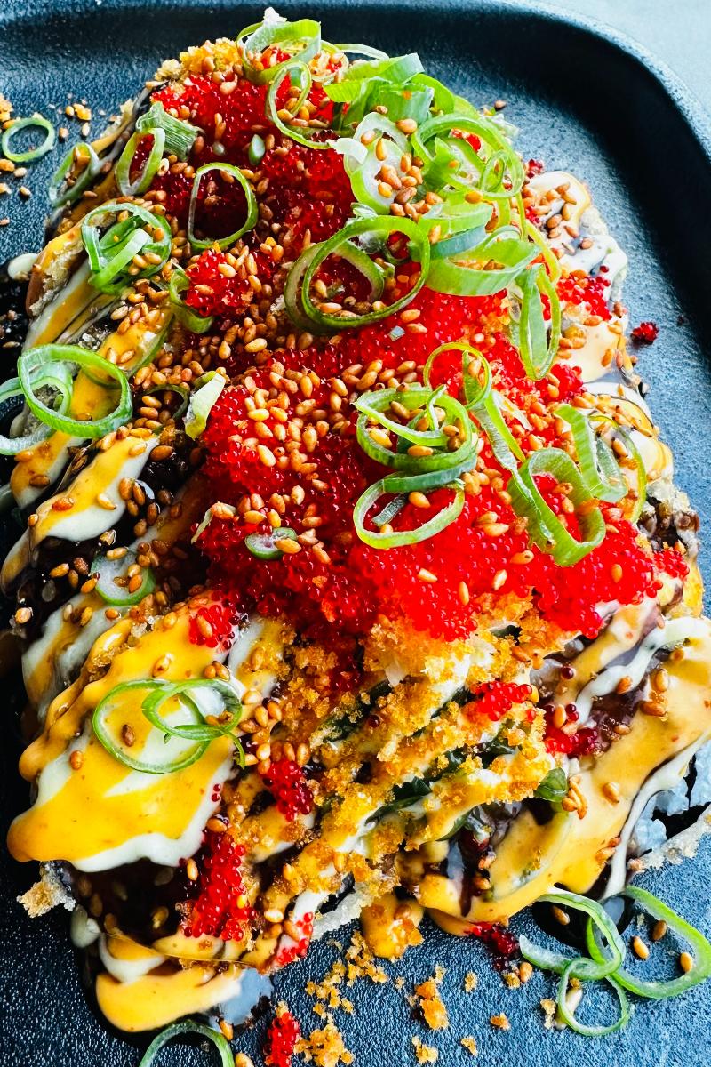 Hot & Dirty Crab toppet med Teriyaki sauce, chili mayo, Wasabi mayo, pickled ginger, wakame, Spicy rice crisp, tobikko, chives & Kim chee sesame.
